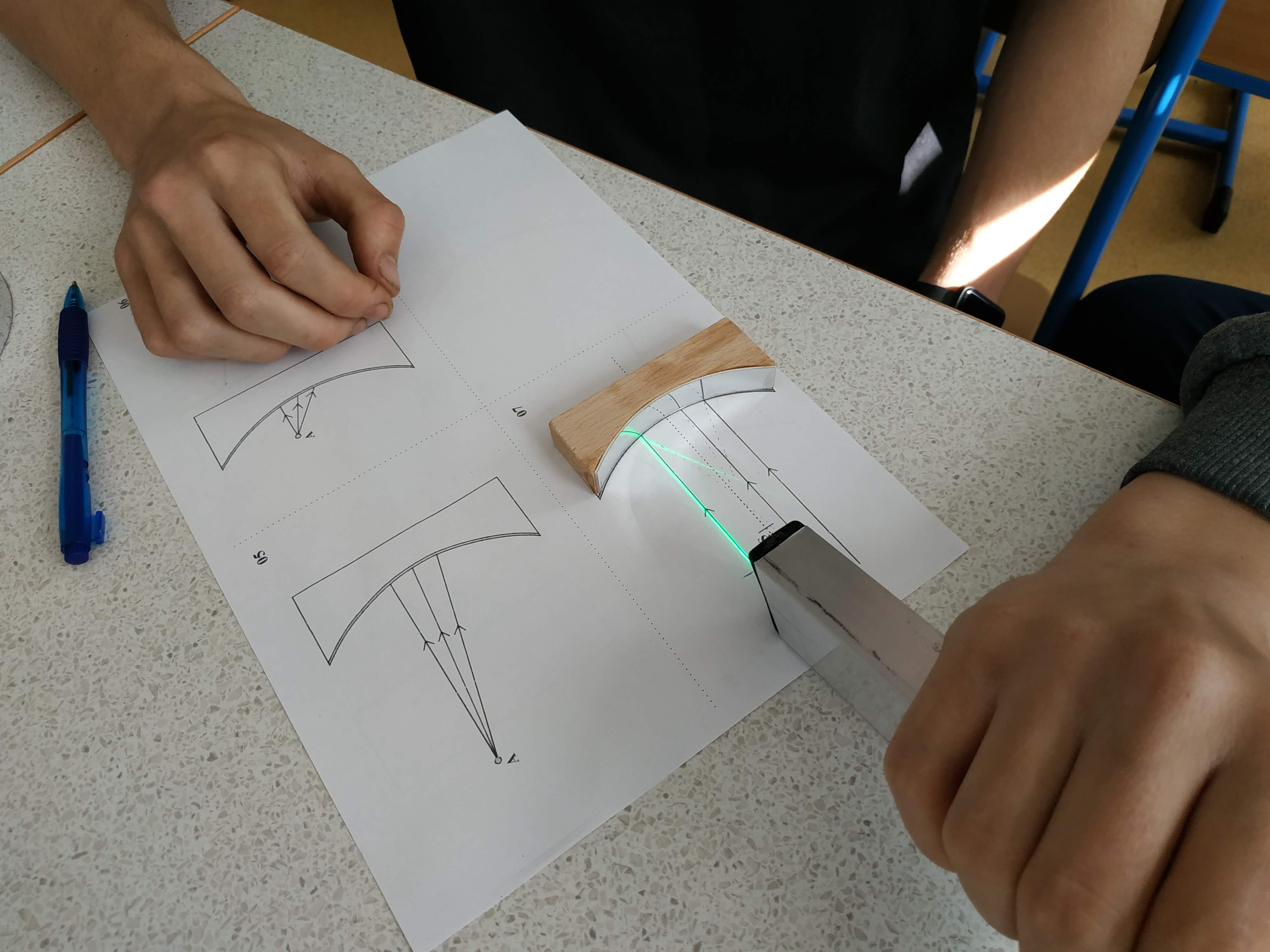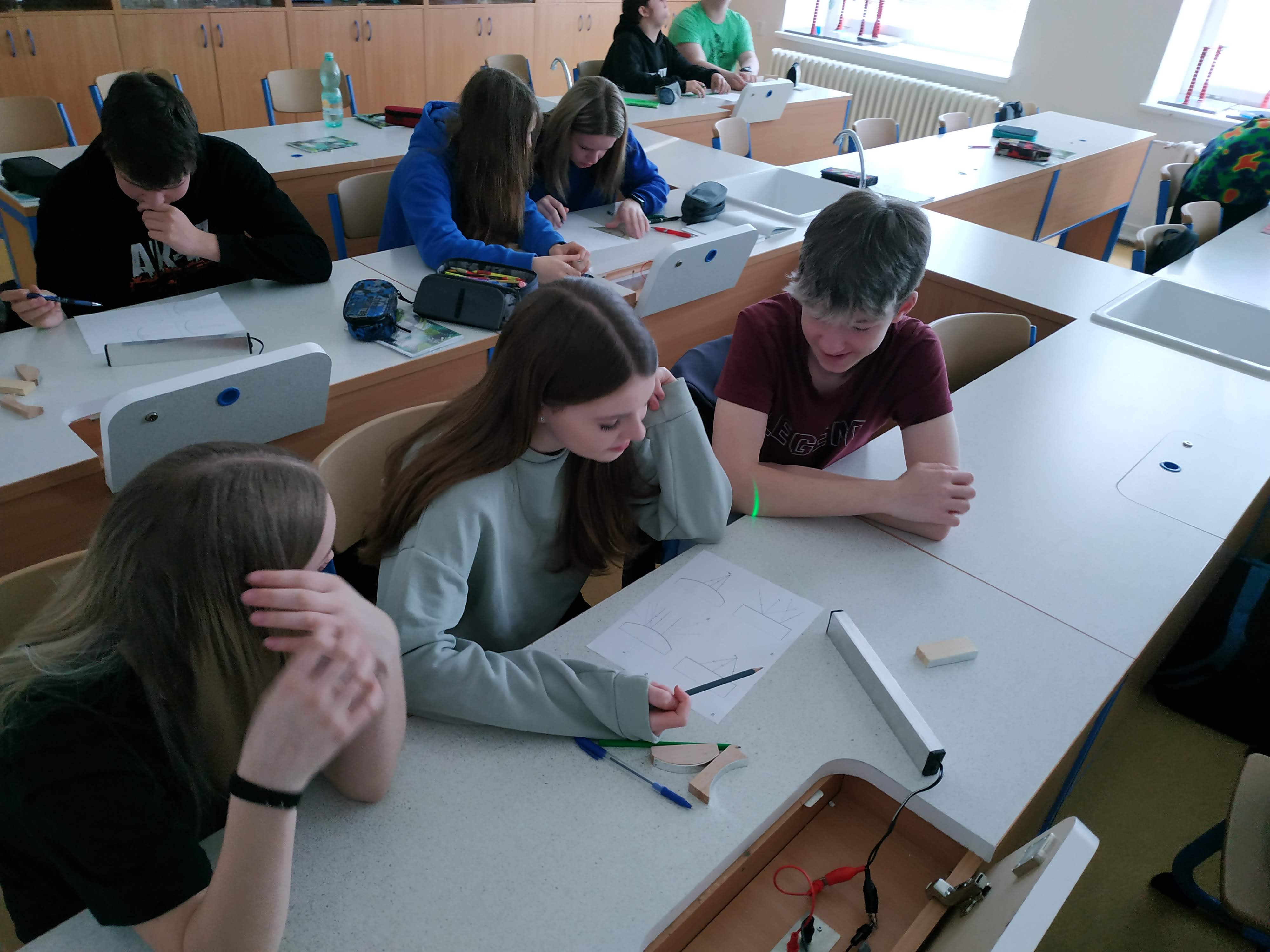 Žáci deváté třídy nyní ve fyzice zkoumají vlastnosti světla a zákonitosti jeho šíření. V dnešní hodině se věnovali odrazu světla a zobrazování předmětů zrcadly. K tomu využívali nejen naše nové pomůcky pro výuku optiky, ale také jimi objevený zákon odrazu světla. Nejdříve do pracovních listů zakreslovali svoje hypotézy = směry odražených paprsků od různých tvarů zrcadlových ploch a poté ověřovali, jak se paprsek odrazí ve skutečnosti. O tom, že badatelství většina z nich vnímá jako přirozenou součást výuky svědčí následující fotografie.