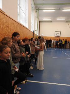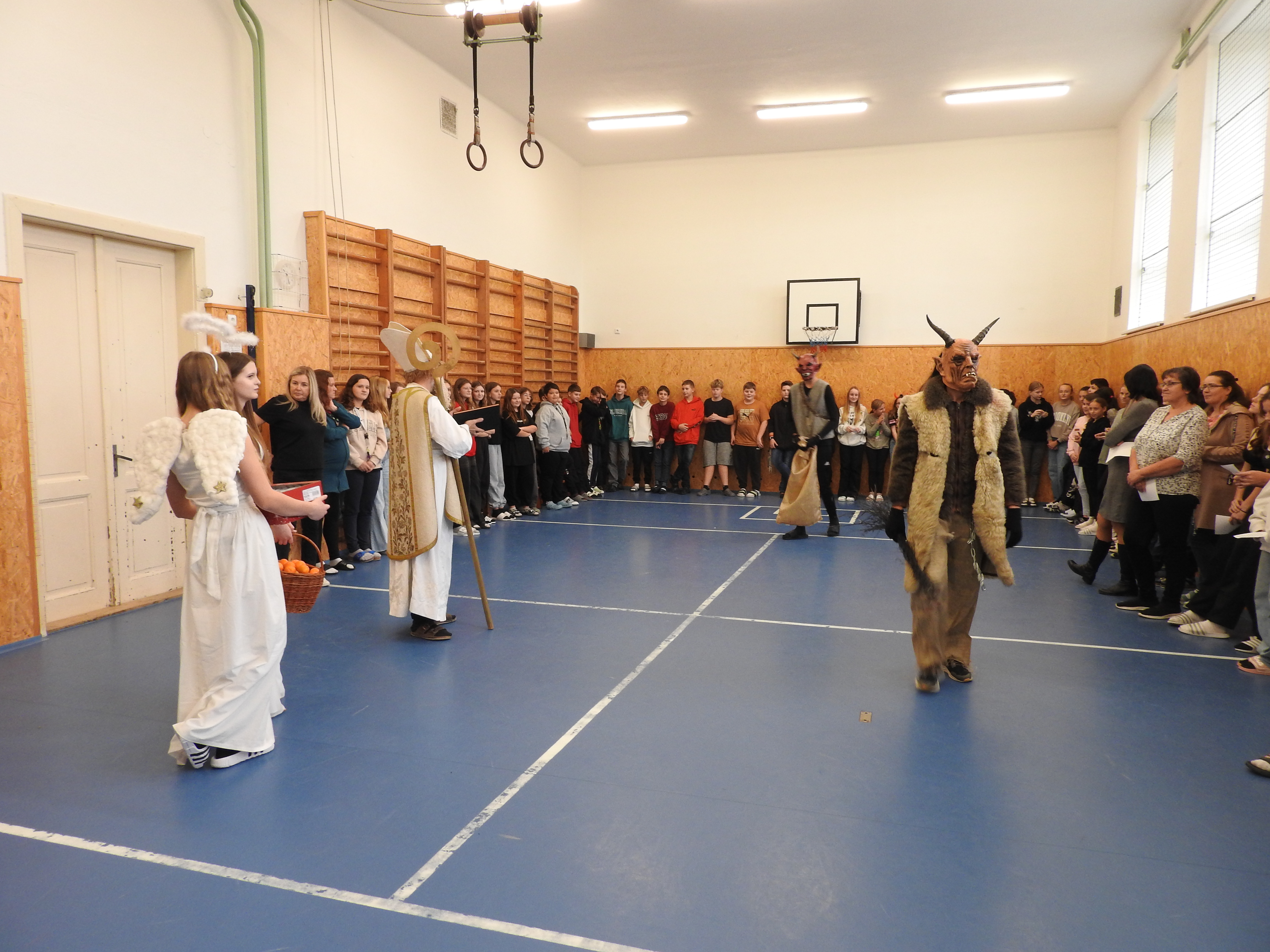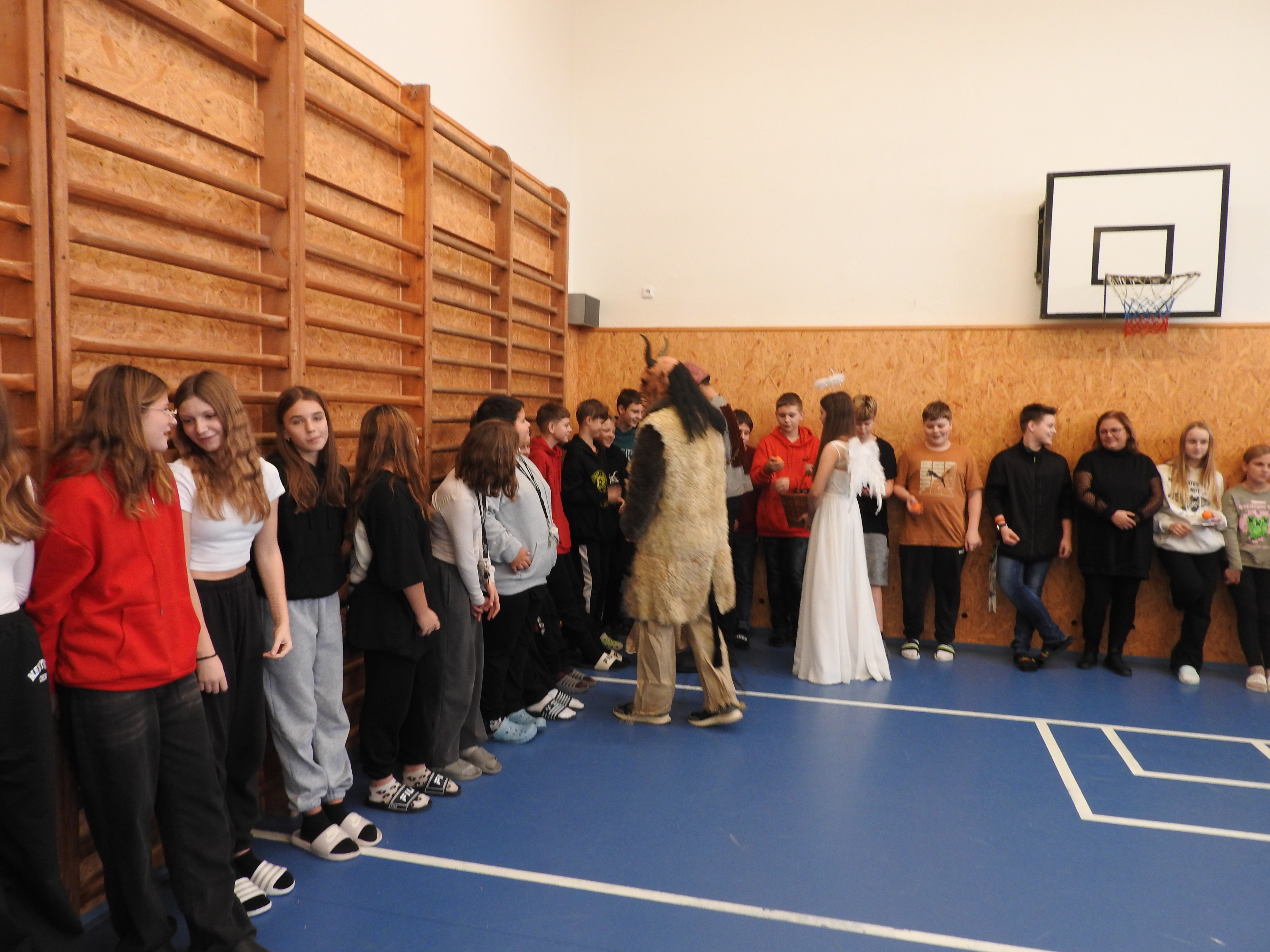 Ve čtvrtek 5. 12. 2024 navštívil naši školu Mikuláš se svojí družinou, tedy s anděly a čerty. Po návštěvě tříd 1. stupně přišel do tělocvičny, kde už netrpělivě čekali žáci druhého stupně, aby si od Mikuláše vyslechli, co se o jednotlivých třídách píše v jeho knize hříchů, ale i dobrých skutků. Každý třídní kolektiv Mikulášovi zazpíval nebo zarecitoval, za to byli všichni odměněni mandarinkou a mikulášským perníkem.