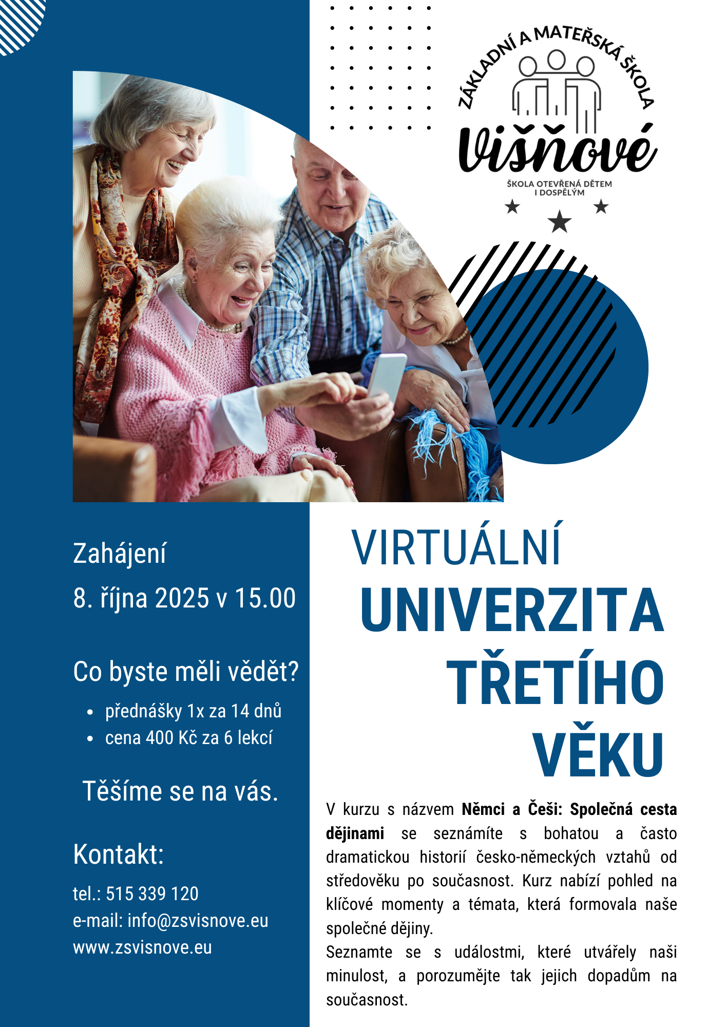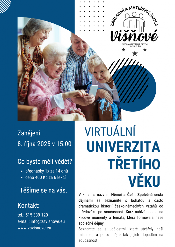 Aktuality Z činnosti školy Pozvánka ke studiu na univerzitě třetího věku 26.9.2025 Jiří Beran Vážení přátelé, 8. října 2025 v 15.00 začíná zimní semestr univerzity 3. věku kurzem s názvem Němci a Češi: Společná cesta dějinami Přijďte se nezávazně seznámit s moderní formou vzdělávání seniorů, těšíme se na setkání.