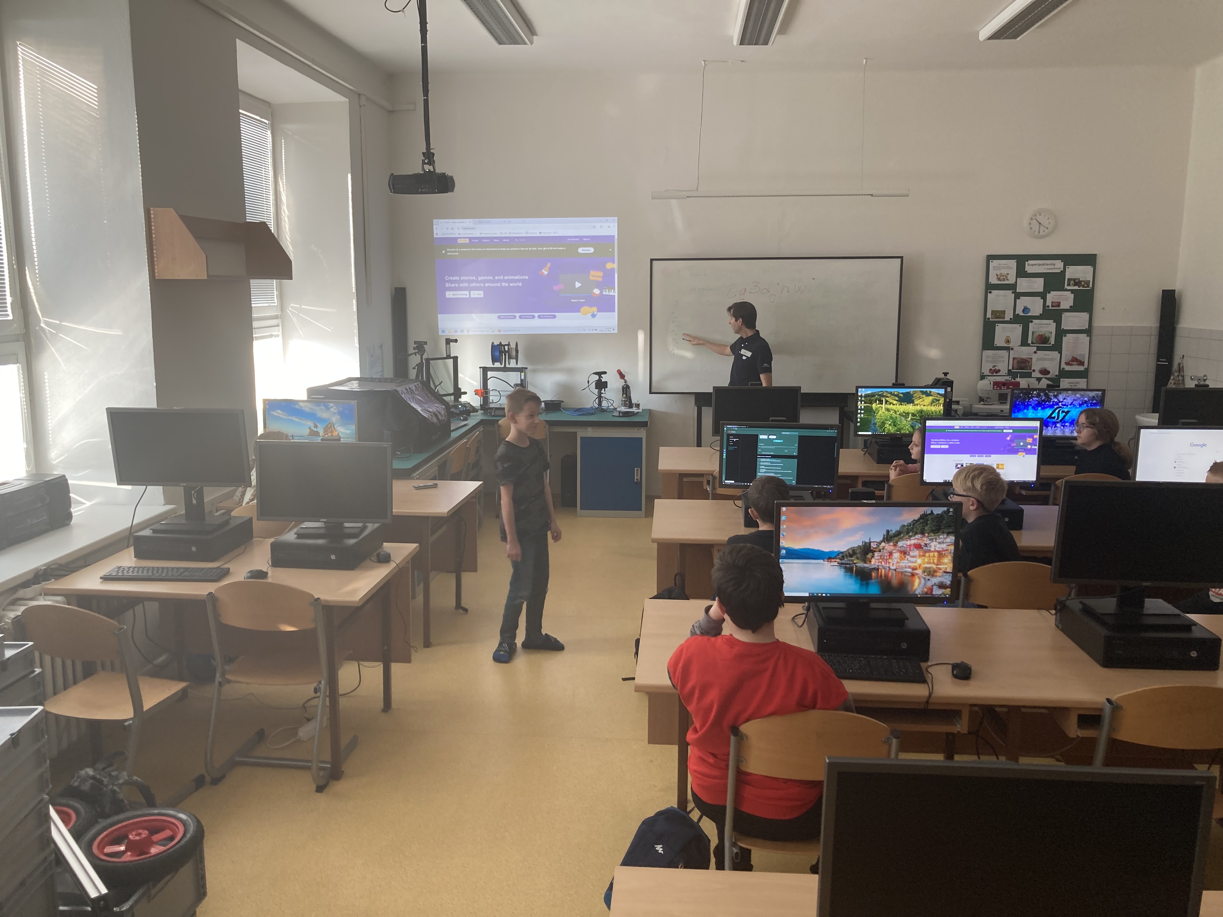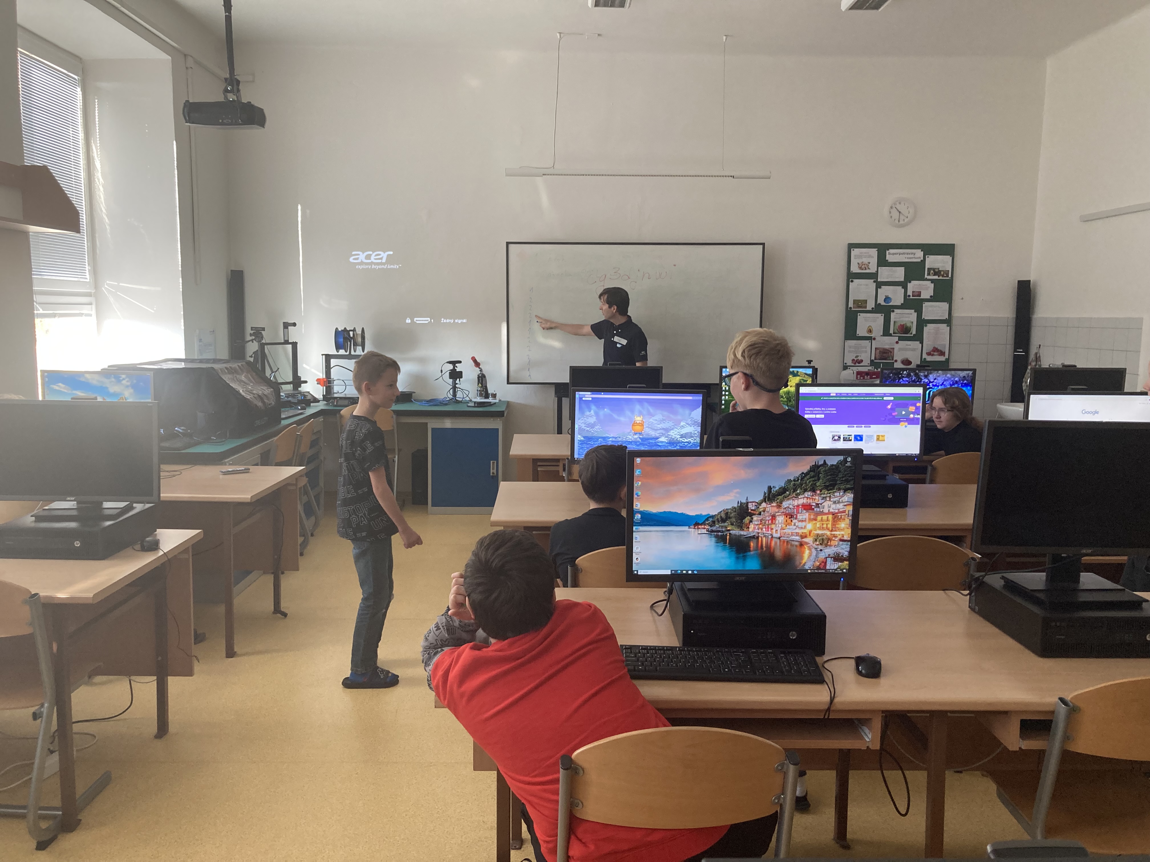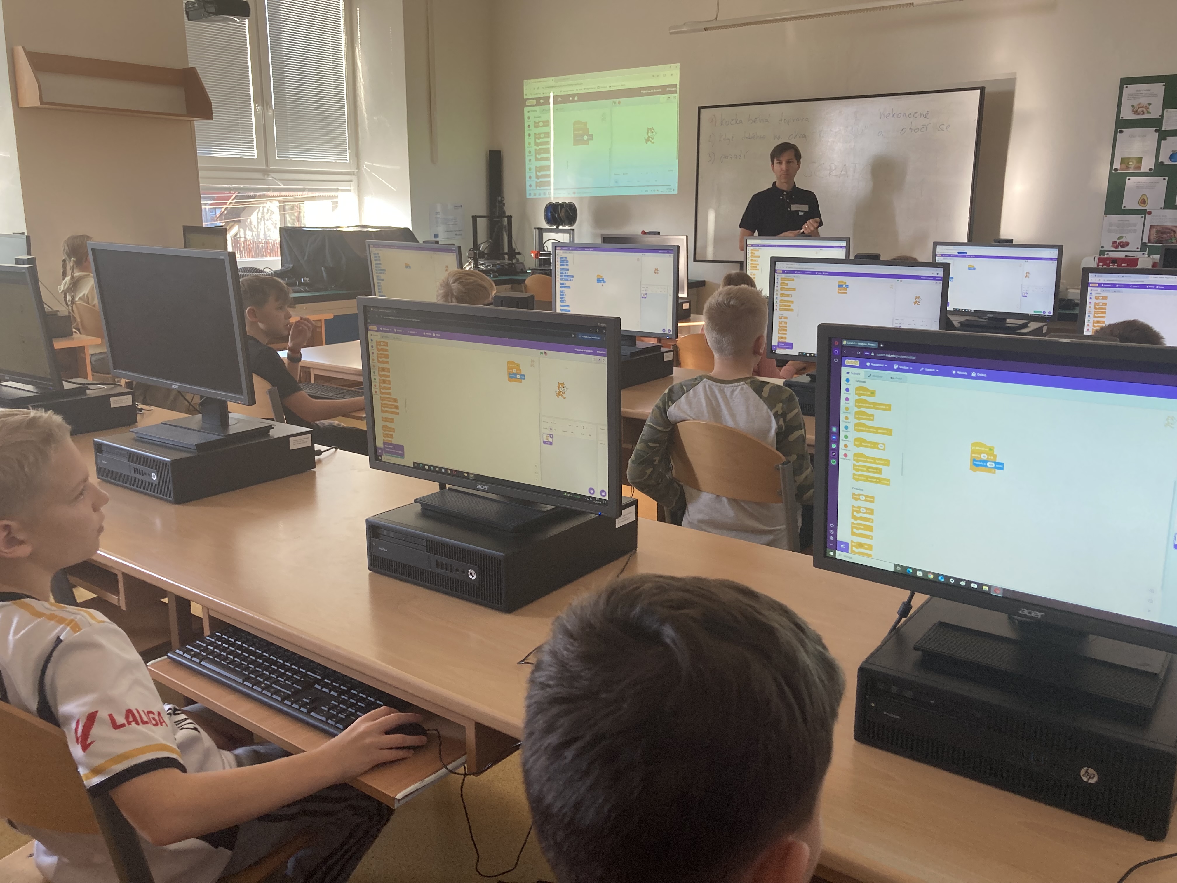 Naši žáci se čím dál častěji mohou ve škole potkávat s odborníky z praxe a to také díky projektu STEM do výuky, jehož jsme součástí. Dnes (5. 11.) za páťáky přijeli programátoři ze společnosti SAP ČR, kteří je během dopoledne provedli základy programování v prostředí SCRATCH. Žáci si po úvodu věnovaném technologiím v běžném životě a práci programátora prakticky vyzkoušeli naprogramovat dvě jednoduché hry, což mnohé z nich naprosto pohltilo. Využili při tom svoji kreativitu, schopnost řešit problémy i logické myšlení.