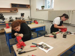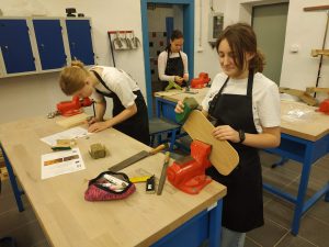 Nedávno škola zakoupila dvě sady krásných pracovních zástěr – hnědé pro práci ve cvičné kuchyni a černé pro práci ve školní dílně. Dívky už svoje zbrusu nové zástěry vyzkoušely, a to ve středu 17. prosince, kdy v nich pekly vánoční perníčky podle rodinného receptu jedné z nich. V zástěrách jim to opravdu velmi slušelo, dívky navíc ocenily jejich praktičnost.:) Perníčky byly výborné, všech různých tvarů. Kromě tradičních hvězdiček, srdíček a stromečků byla upečena i perníková ještěrka a had. 🙂