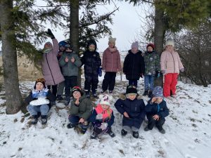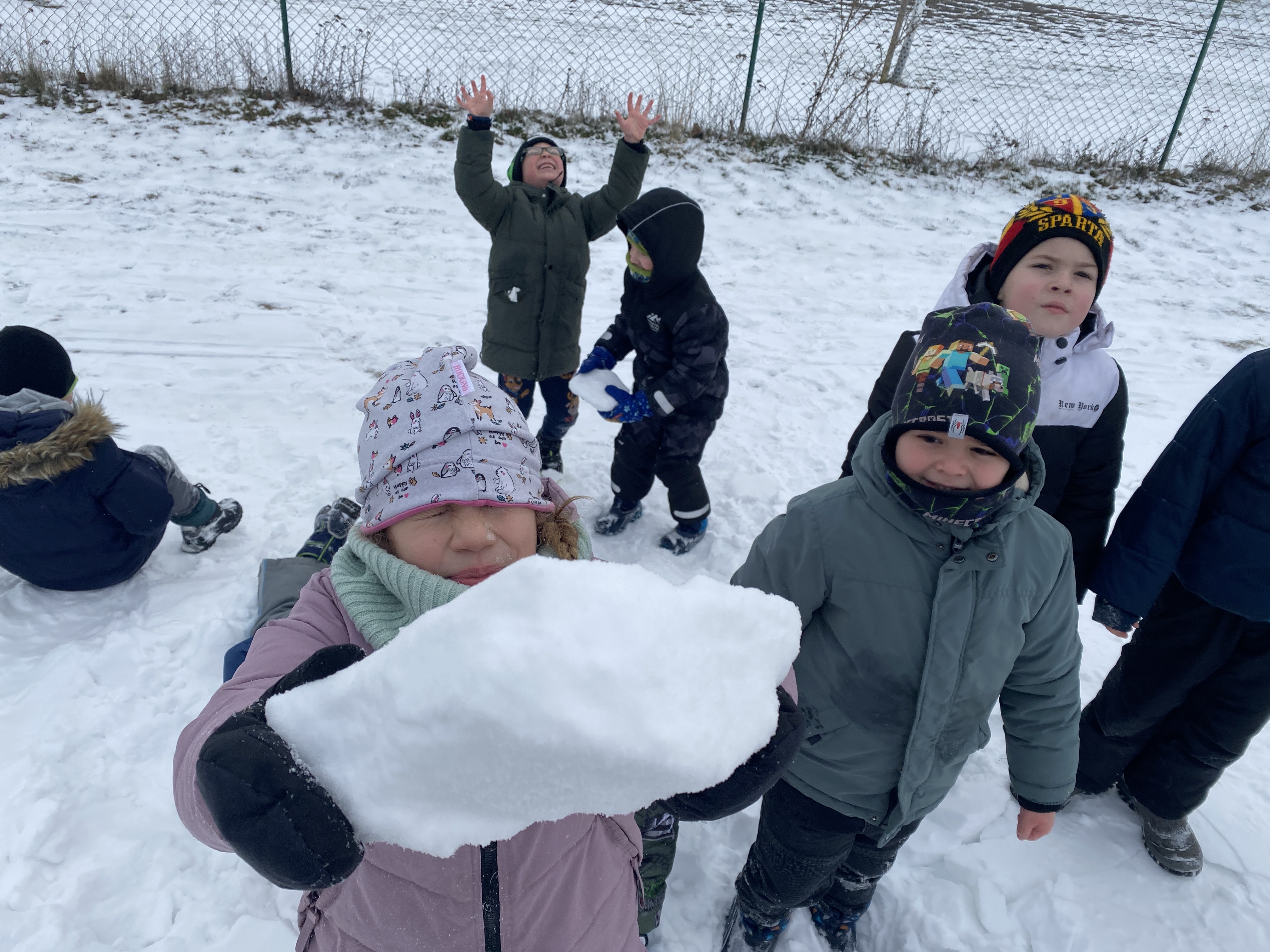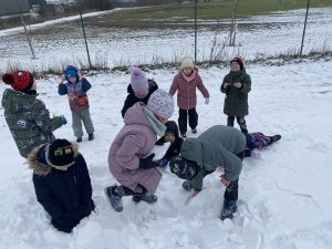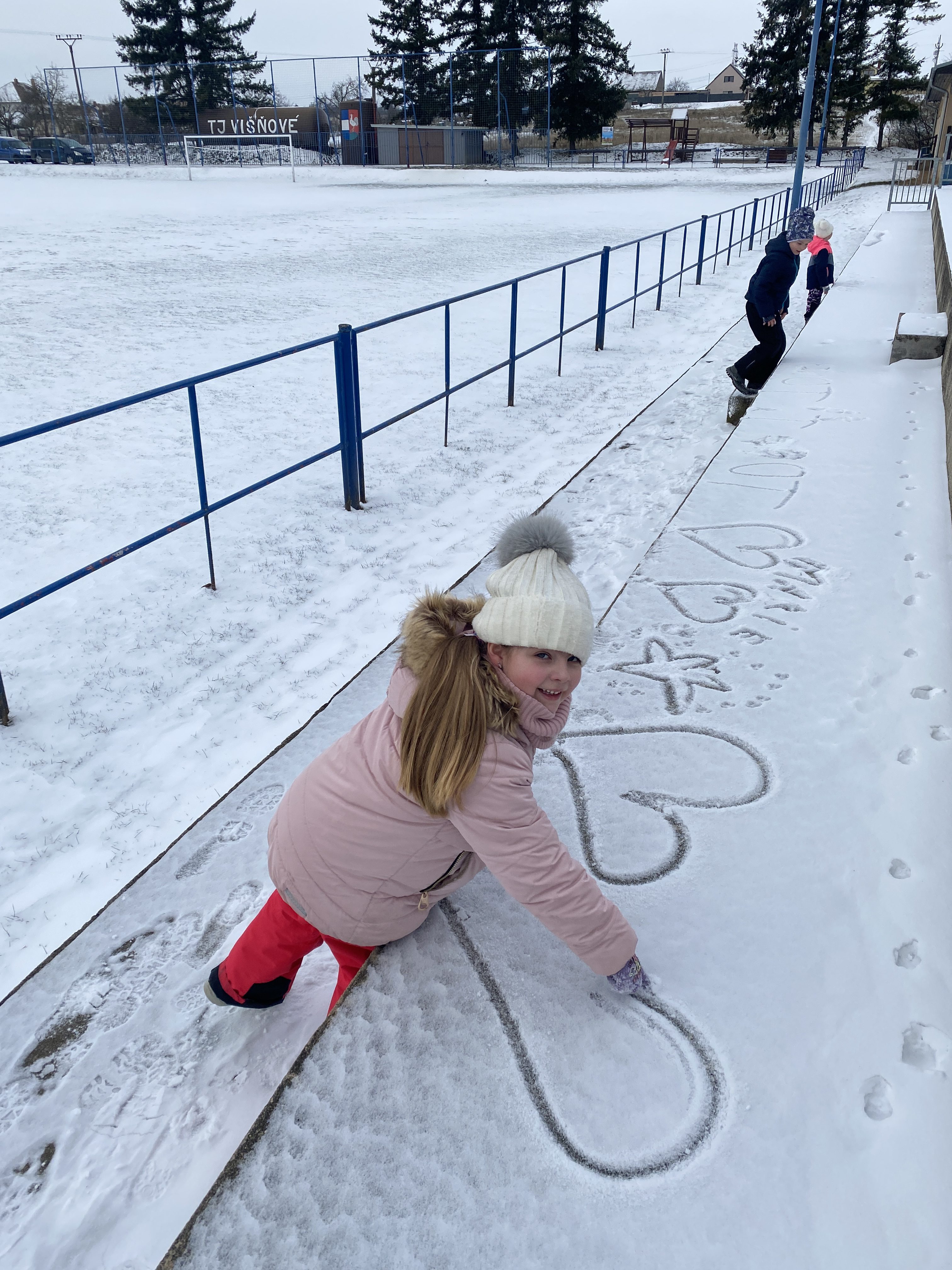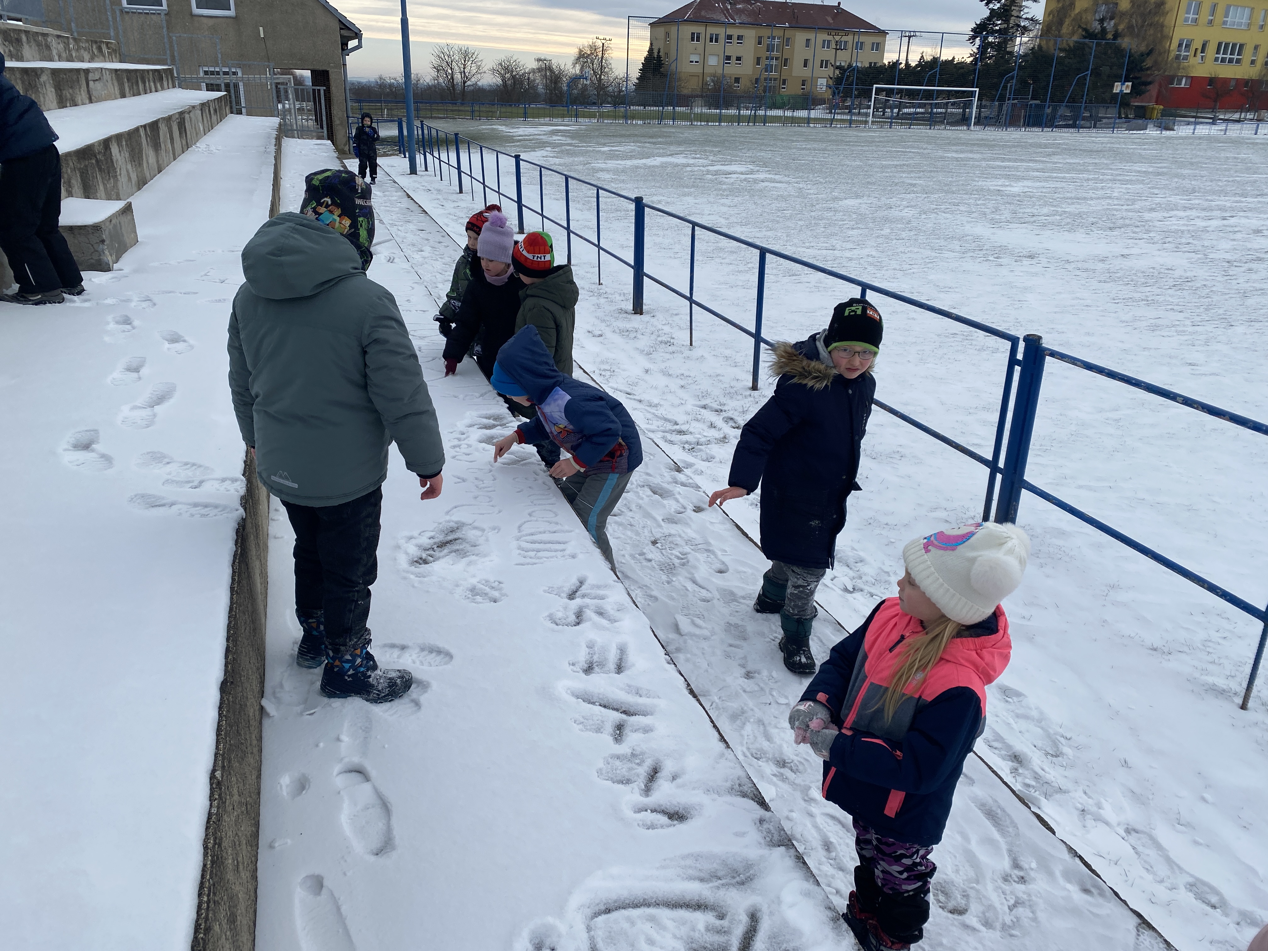 Ani mrazivé počasí neodradilo prvňáčky od pobytu venku. V tělesné výchově jsme se vydali na školní hřiště a jeho okolí prozkoumat kvalitu sněhu. Za krátkou chvíli jsme si užili hodně pohybu, radostného dovádění a otužování – chyběly rukavice, a vůbec nám to nevadilo. Vyzkoušeli jsme si také psaní písmen a jednoduchých slov do sněhu, takže se pohyb přirozeně propojil s učením.