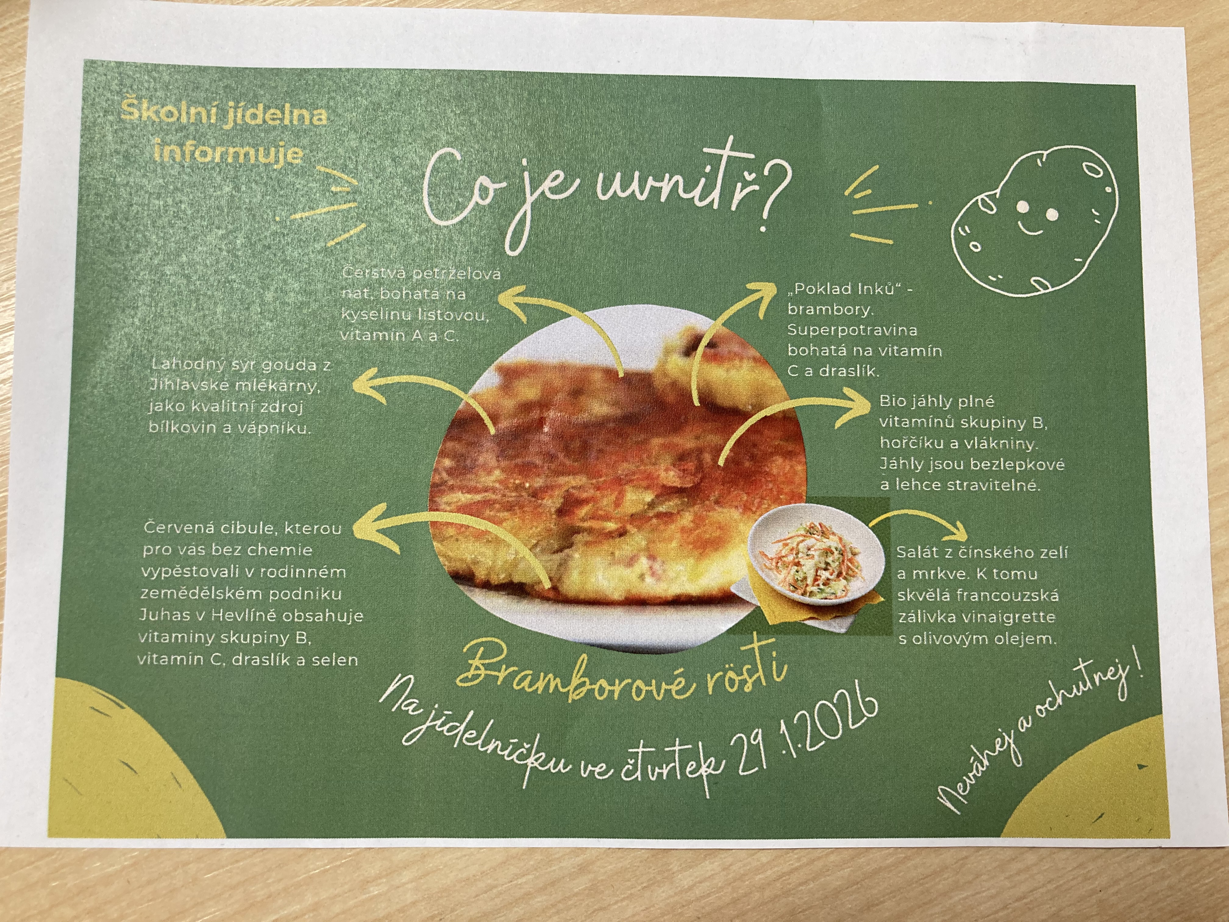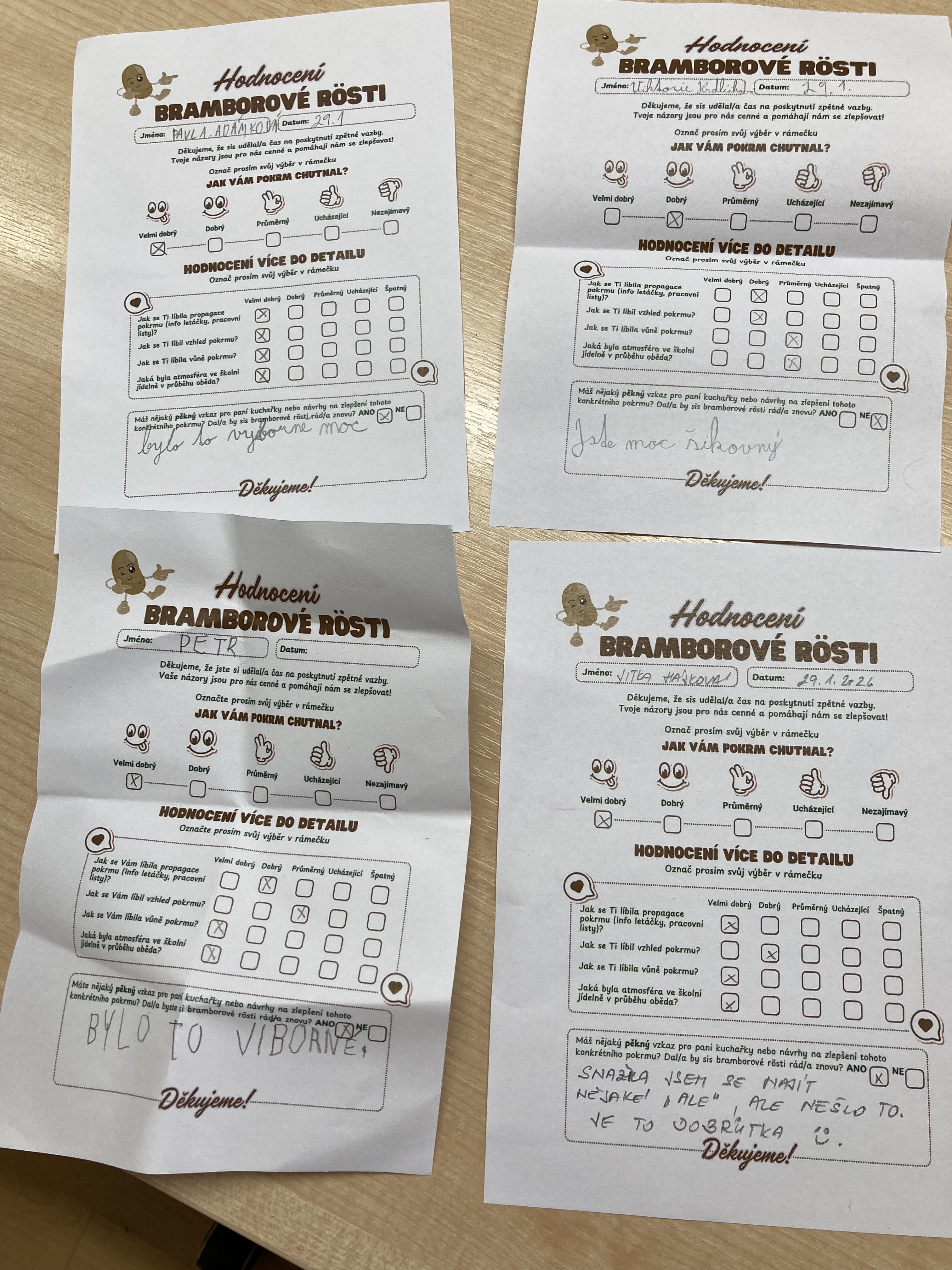 Ve čtvrtek 29. ledna připravily paní kuchařky v naší školní jídelně další novinku doporučenou poradkyní paní Andreou Hruškovou. Tentokrát se jednalo o jídlo s velmi zajímavým názvem – BRAMBOROVÉ RÖSTI. I v tomto případě jsme všechny strávníky podrobně informovali o tom, z jakých surovin byl tento pokrm uvařen, a věřte, že to byly opět samé kvalitní a našemu zdraví prospěšné suroviny (super potravina brambory, BIO jáhly, sýr gouda z jihlavské mlékárny, červená cibule z farma Juhas v Hevlíně a čestvá petrželová nať). Znovu byly k dispozici výukové materiály, které vyučující mohli využít ve své výuce, aby děti na nové jídlo patřičně namotivovali. A pak přišel čtvrtek 29. ledna, kdy se děti ve škole těšily hned z několika věcí: celoškolní projektový den, vysvědčení za 1. pololetí, volný pátek a nové jídlo ve školní jídelně, které o sobě dávalo už od rána vědět příjemnou vůní linoucí se celou budovou. A jak to dopadlo? Jsme rádi, že můžeme říct: “Dopadlo to skvěle!” Většině strávníků tyto netradiční zapečené brambory chutnaly velmi a dali by si je rádi znovu (celkem 78 hlasů), někomu míň a někdo by si je znovu nepřál (13 hlasů). Velké množství strávníků ocenilo salát z čínského zelí se zálivkou vinaigrette. To vše jsme se dozvěděli z připravených hodnotících dotazníků. Z nich jsem vybrali pár hodnocení, která paní kuchařky jistě velmi potěšila: