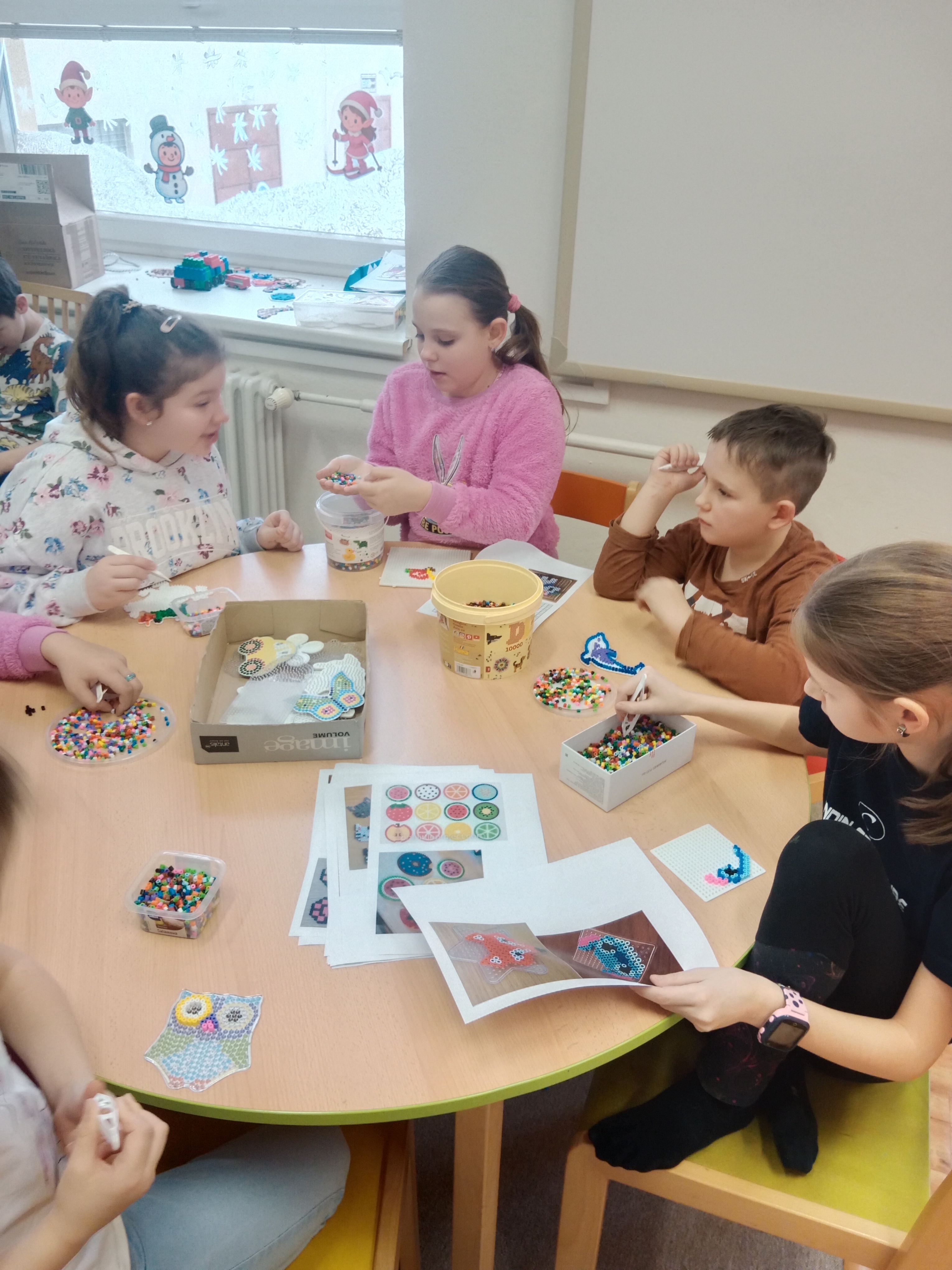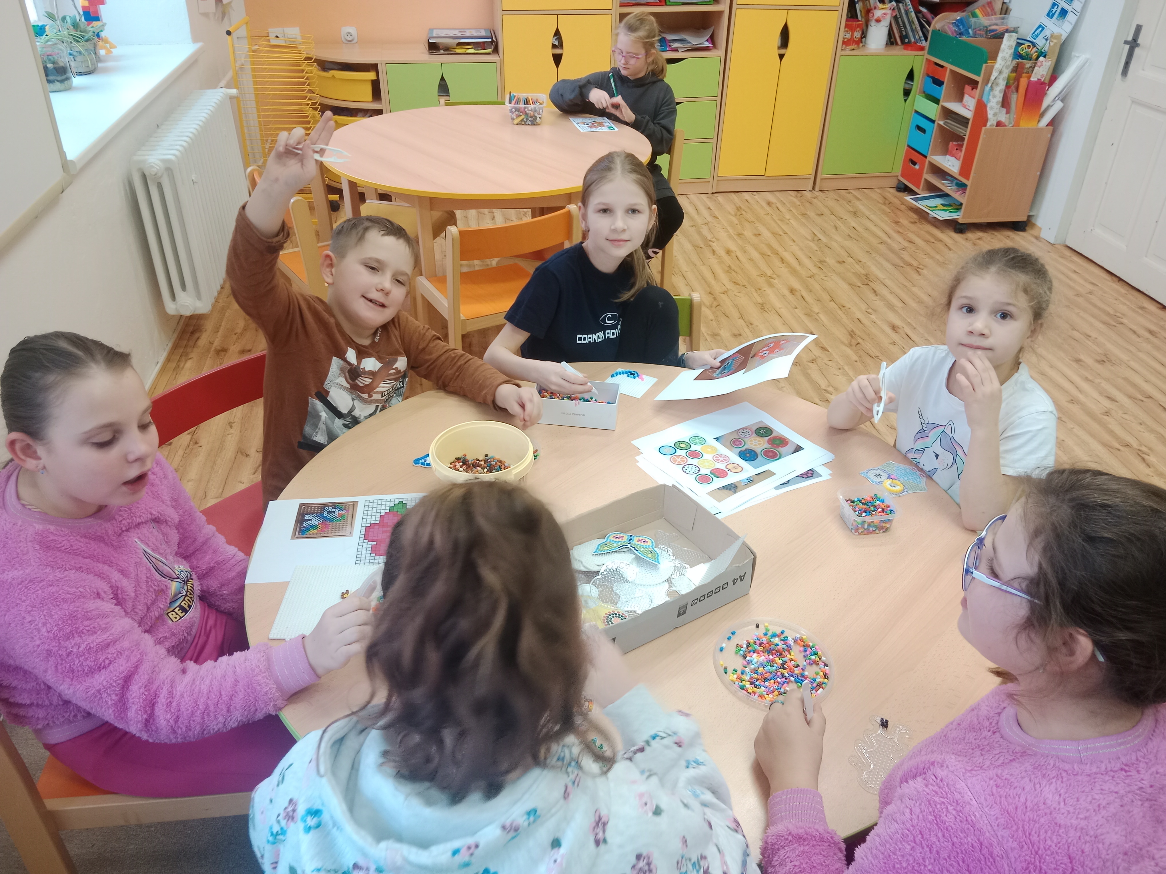 I když je venku nevlídné počasí, které láká spíše k zalezení pod deku, ve školní družině je živo a veselo. Děti si tu umí najít spoustu zábavy a dobrou náladu. Velkou oblibu mají stolní hry, malování obrázků a další výtvarné činnosti, při kterých vznikají krásná a nápaditá díla. V poslední době si však děti nejvíce oblíbily kreativní tvoření ze zažehlovacích korálků, z kterých skládají nejrůznější obrázky, zvířátka, srdíčka i vlastní originální návrhy. Tato činnost nejen baví, ale také rozvíjí fantazii, trpělivost a jemnou motoriku. Každý výrobek je jedinečný a děti mají velkou radost, když si mohou svůj výtvor odnést domů. Ve školní družině není o zábavu nouze.