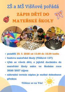 srdečně Vás zveme na zápis dětí k předškolnímu vzdělávání v Mateřské škole Višňové pro školní rok 2026/2027, který proběhne 23. března. 2026 v době od 15.00 do 16.00 hodin v budově Mateřské školy ve Višňovém.
