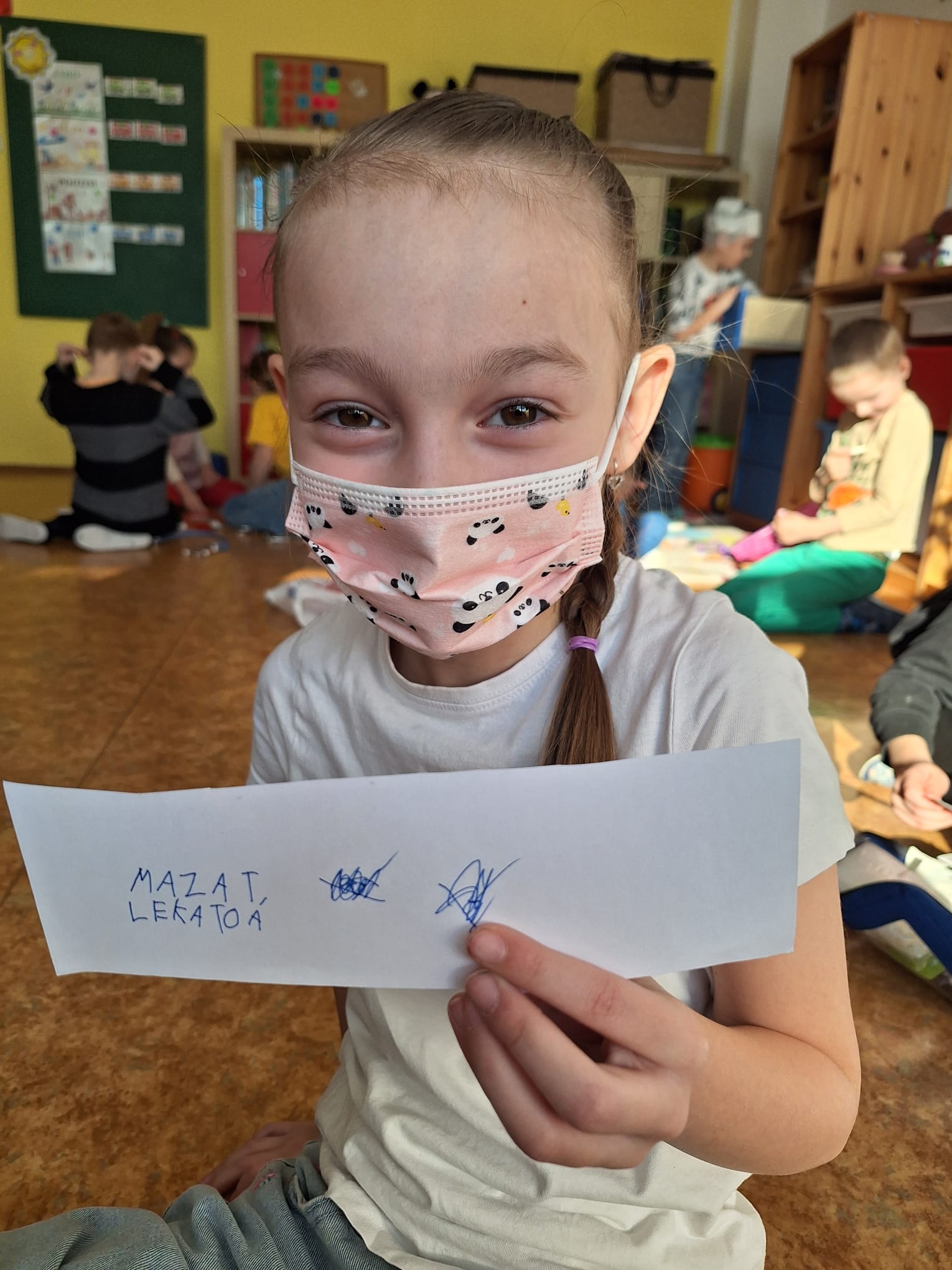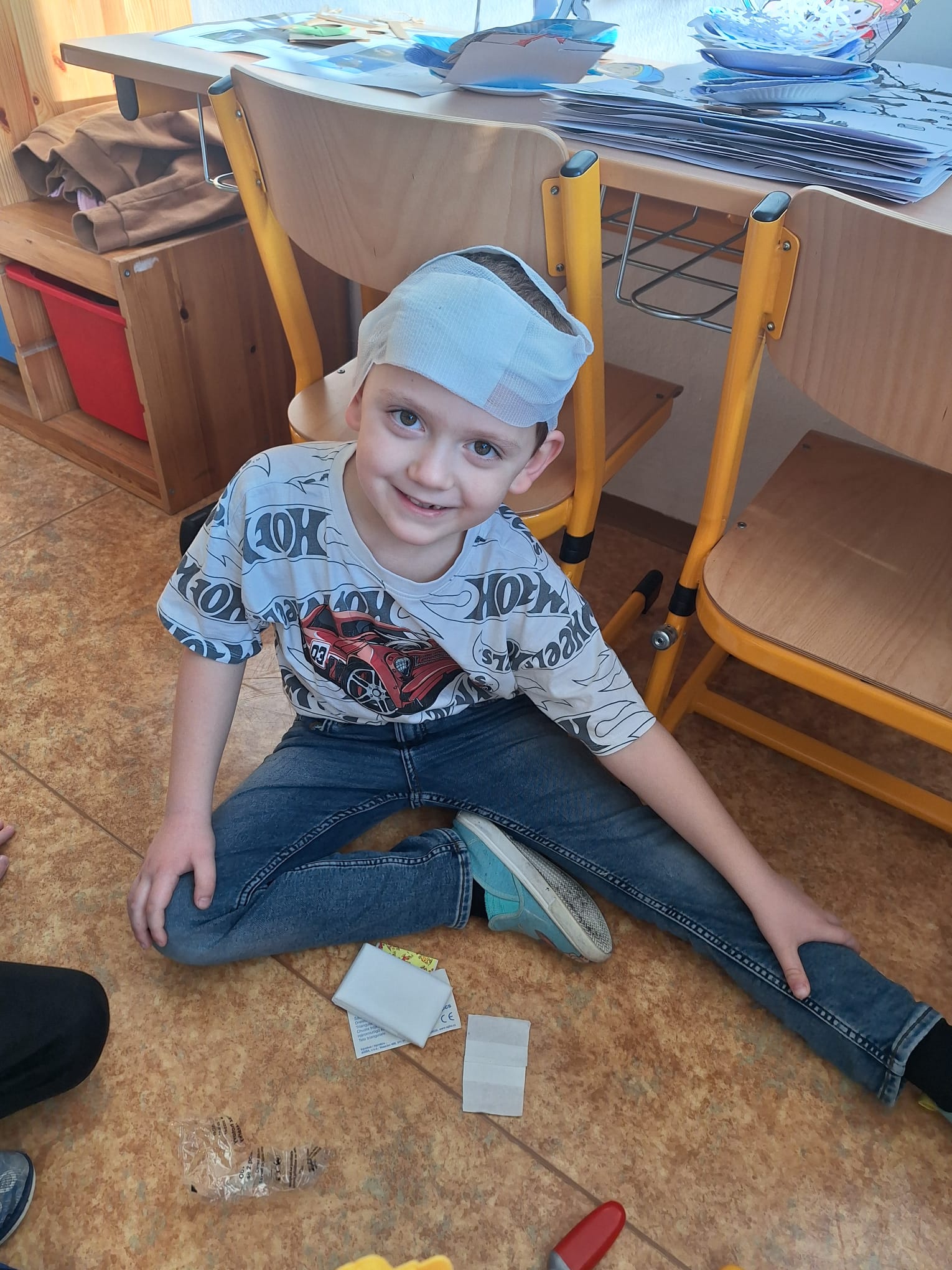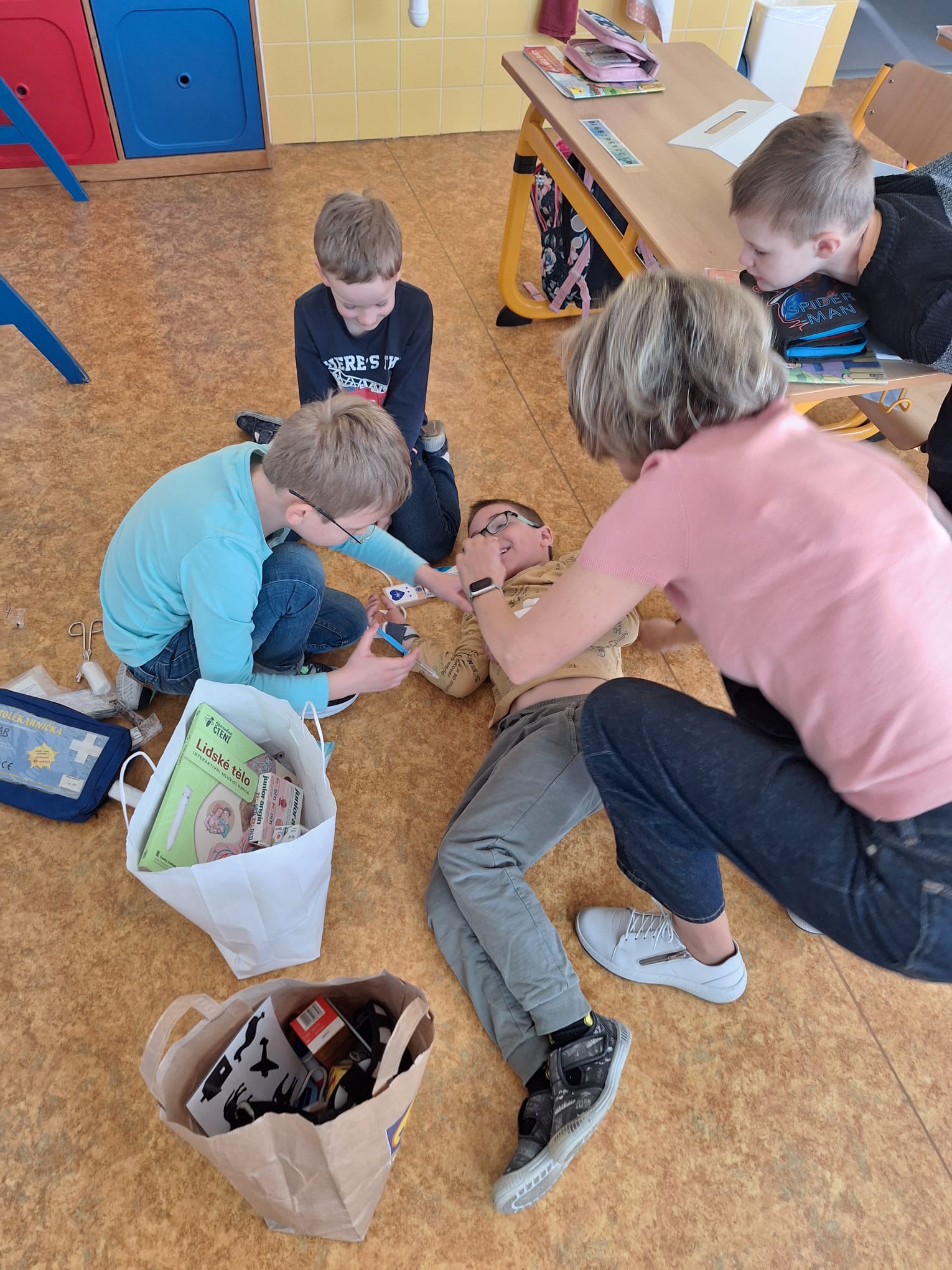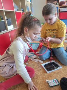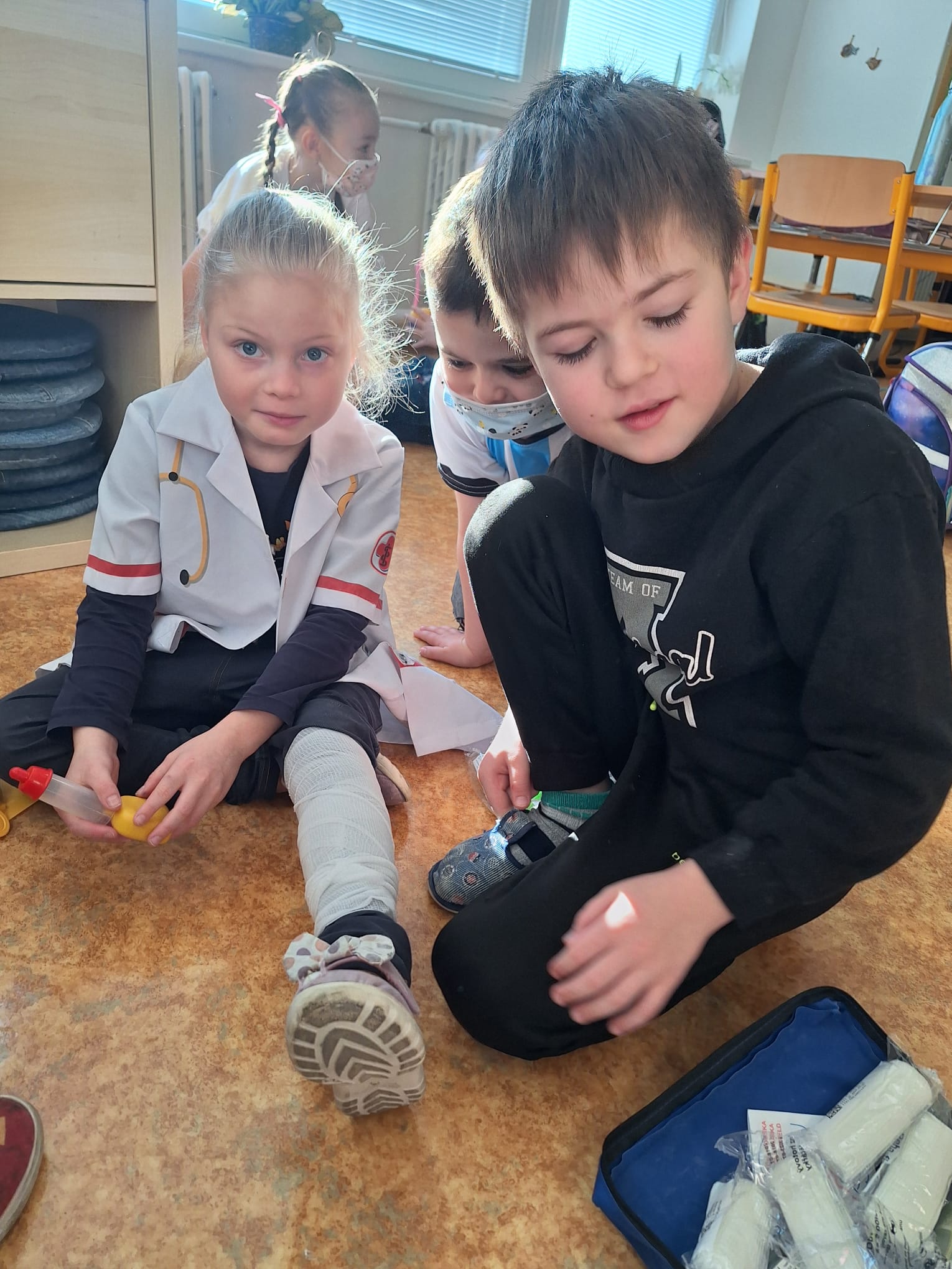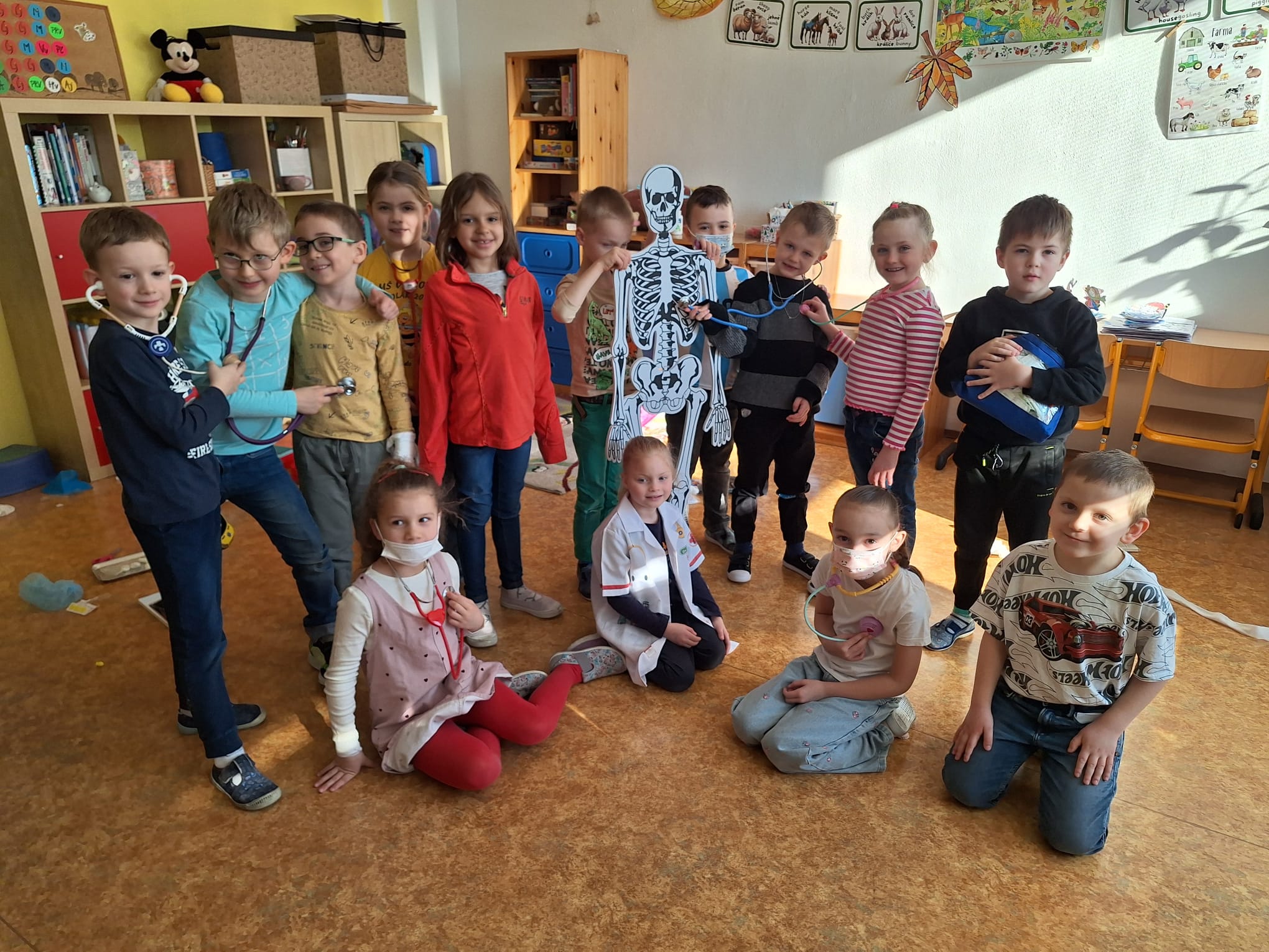 Na závěr si děti nejprve vyzkoušely krátký test z probraného učiva a pak se pustili do praktických aktivit – třída se proměnila v malou nemocnici. Děti pracovaly ve dvojicích a střídaly se v rolích lékařů, sestřiček i pacientů. Zkoušely ošetřit drobná zranění, přemýšlely, jak poskytnout první pomoc a hlavně jak nemocem a úrazům předcházet. Děti se do svých rolí opravdu vžily – někdy až tak, že bylo těžké poznat, kdo je lékař a kdo pacient.