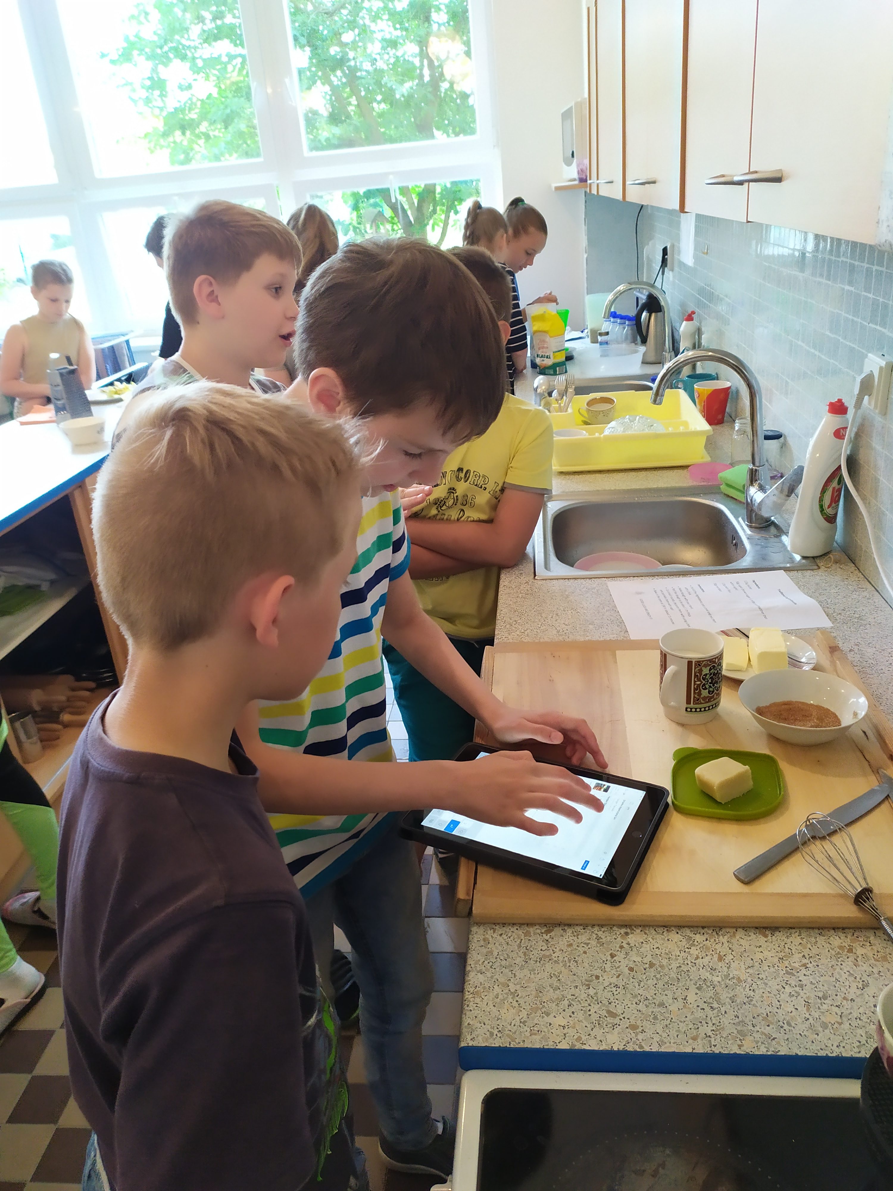 Takřka dva měsíce se čtvrťáci v angličtině zabývali tématem FOOD AND DRINKS. Rozšířili si slovní zásobu o spoustu slovíček a užitečných frází, naučili se, jak si v cizině nakoupit, vymýšleli jídelní lístek, mluvili o zdravých a nezdravých potravinách, přečetli mnoho textů, zpívali oblíbenou písničku Sausages with ice-cream a zhlédli několik videí. V pátek 3. června na ně čekal speciální úkol – upéct jeden ze čtyř typických anglických dezertů. Čtvrťáci se nejprve rozdělili do čtyř skupin, pak si vylosovali dezert a pak se mohli pustit do práce. Nejprve si museli přečíst recept a podle něj připravit suroviny v potřebném množství. Holky a kluci překládali, hledali ve slovníku, co nevěděli, vážili, odměřovali, loupali, krájeli, míchali, či hnětli těsto. Všichni se snažili, nikdo nelenošil a tak mohli na konci devadesátiminutového bloku angličtiny ochutnat tea biscuits s marcipánem, oblíbené sušenky shortbread, koláč apple crumble a jablečné cupcakes. Všechny upečené sladkosti chutnaly výborně, čtvrťáci byli pochváleni nejenom paní učitelkou a paní asistentkou, ale také panem ředitelem.