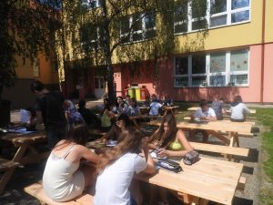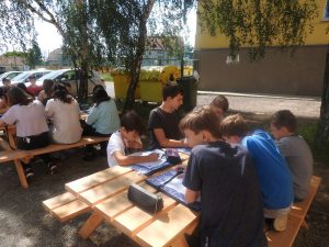 Nejen v českém jazyce v těchto dnech probíhá závěrečné opakování probraného učiva. Taky sedmáci se pustili v rámci procvičování do pracovního listu s úkoly ze skladby, a protože po českém jazyce následovala hodina výtvarné výchovy, vytvořili ke každému cvičení vhodný obrázek. Všechno jim šlo pěkně od ruky, navíc tvořili ve venkovní učebně na čerstvém vzduchu.