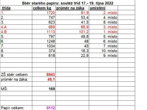 Říjnové kolo soutěže tříd ve sběru starého papíru opanovaly třídy 1. stupně. Na třetím místě skončila4.A s průměrem 66,9 kg papíru na žáka. Druzí byli prvňáci s průměrem 81,9 kilo. Vítěznou třídou je 4.B s průměrem 101,2 kg starého papíru na žáka. Vítězné třídy obdržely poukázky na 1000, 500 a 250 korun. Celkem jsme nasbírali úctyhodných 9 112 kilogramů a tento sběr se tak řadí k těm nejúspěšnějším. Protože jsme papír řádně roztřídili, je i finanční výtěžek nemalý.