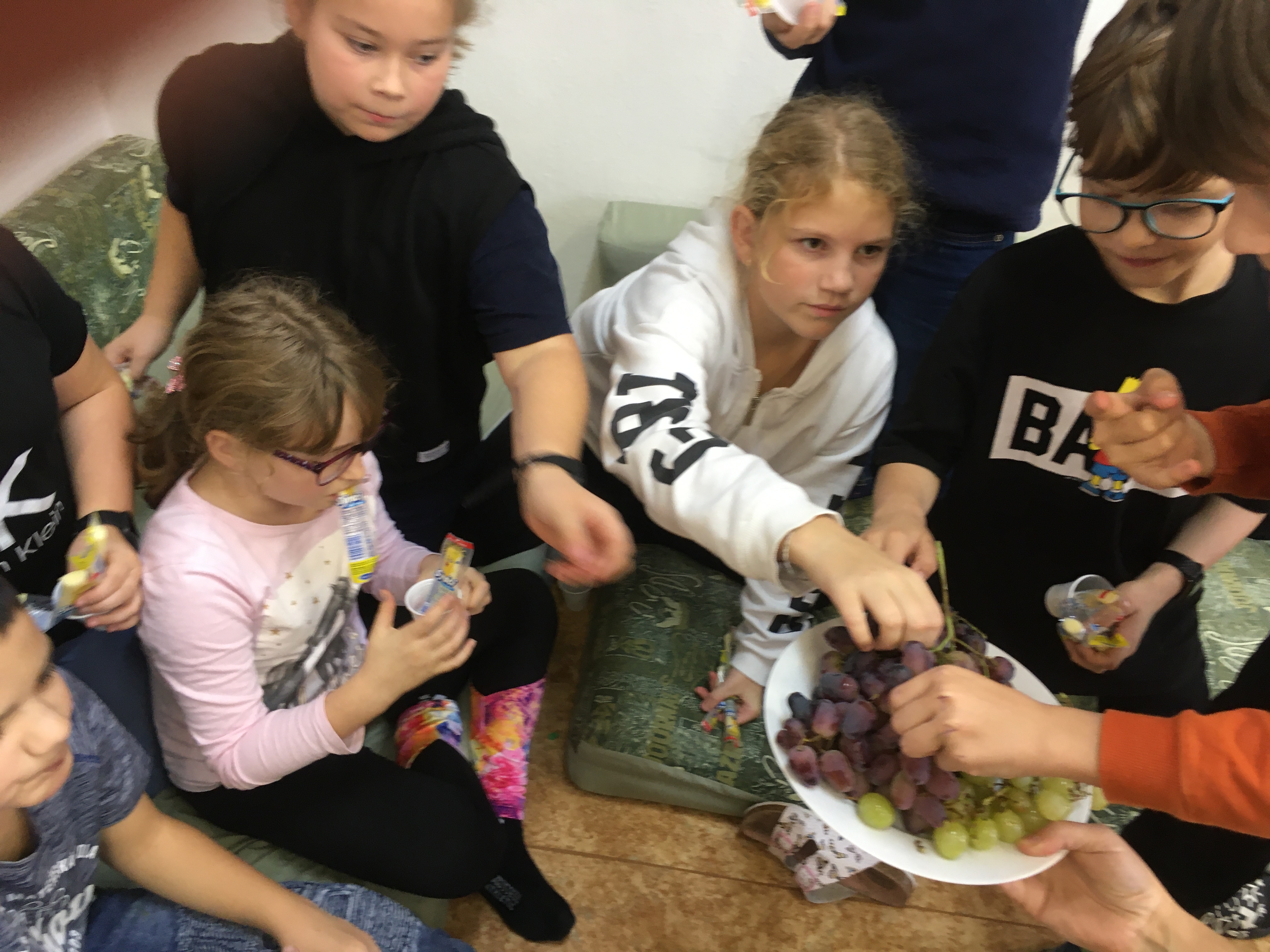Čtvrteční svačinu, bohatou na vitamíny A, C a E, si děti prvního stupně zpestřily ochutnávkou hroznového vína a 100% šťávou z hroznů. Réva vinná rozmanitých barev od zelené, žluté po červenou až tmavě fialovou dětem učarovala. Ochutnávaly a porovnávaly dodané druhy, posuzovaly vzhledově i chuťově.